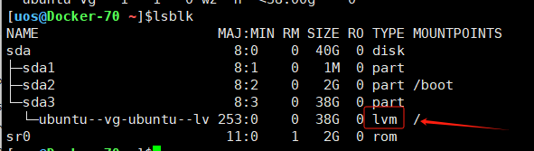 [uos@Docker-70 ~]$sudo lvextend -l +100%free /dev/ubuntu-vg/ubuntu-lv
